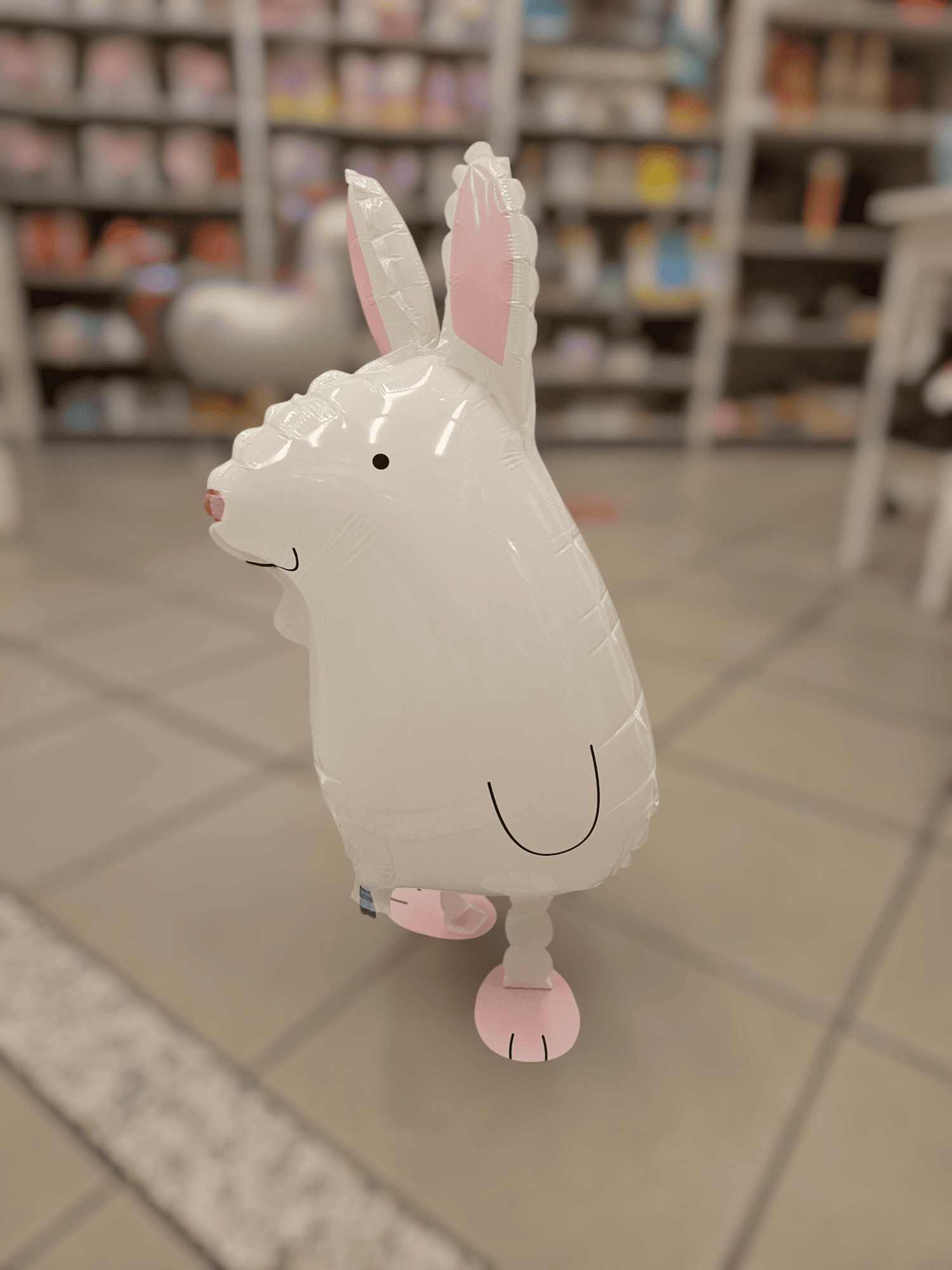 Zuckersüß ist dieser niedliche Airwalker Ballon in Häschen Form. Er ist etwa 40 cm hoch und bei Abholung mit Helium gefüllt. In weiß mit hübschem rosa Ohren und Nase bewegt der kleine Hasenballon sich mit dem Windzug durch den Raum. Durch das Gewicht der Füße bleibt er am Boden stehen.