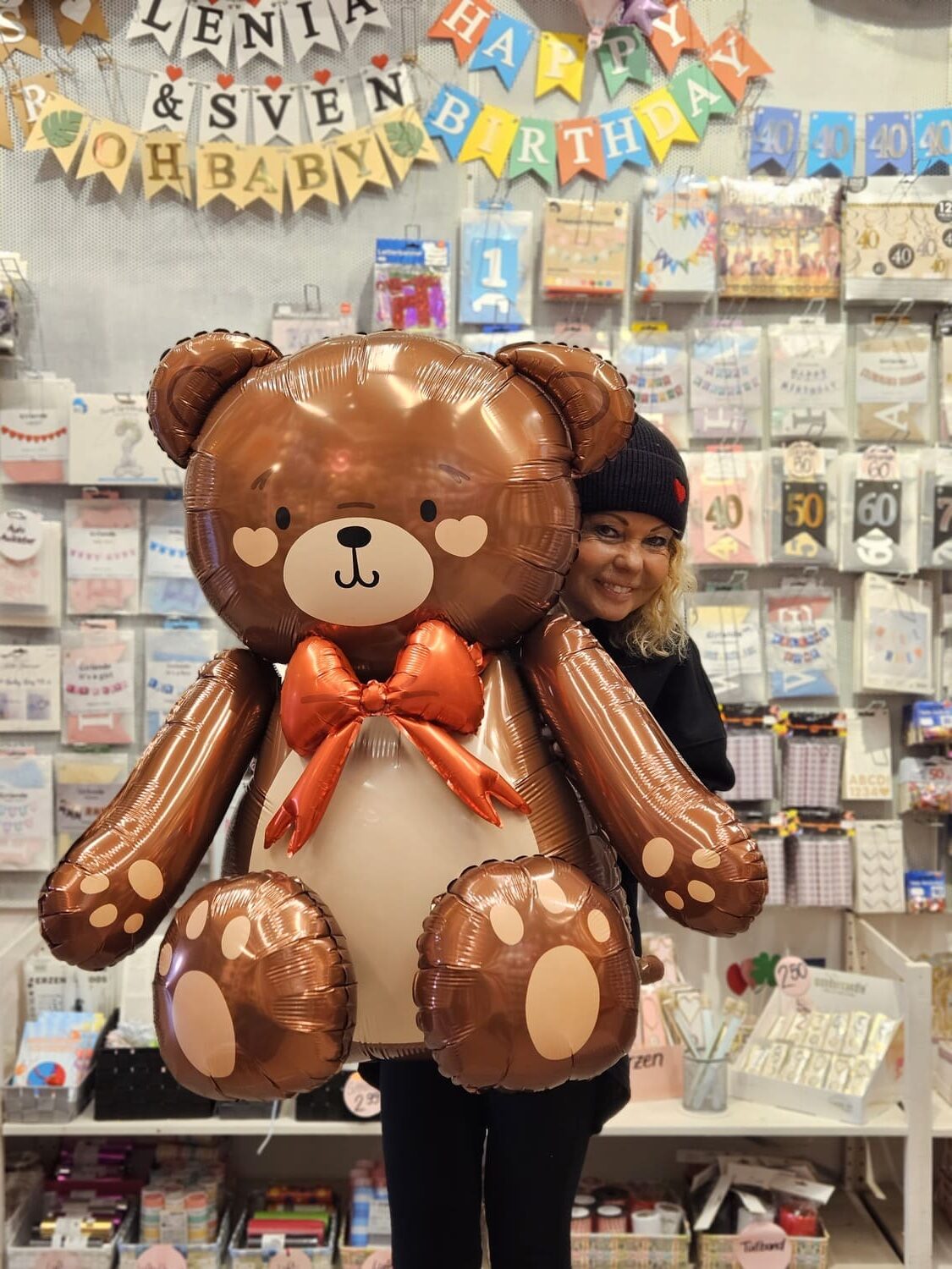 Wow was für ein toller Hingucker ist dieser supersüße Teddybär! Mit seinen niedlichen Augen, der roten Schleife und seiner imposanten Größe von ca. 85 cm ist er ein absoluter Liebling in unserer Ballon Familie.