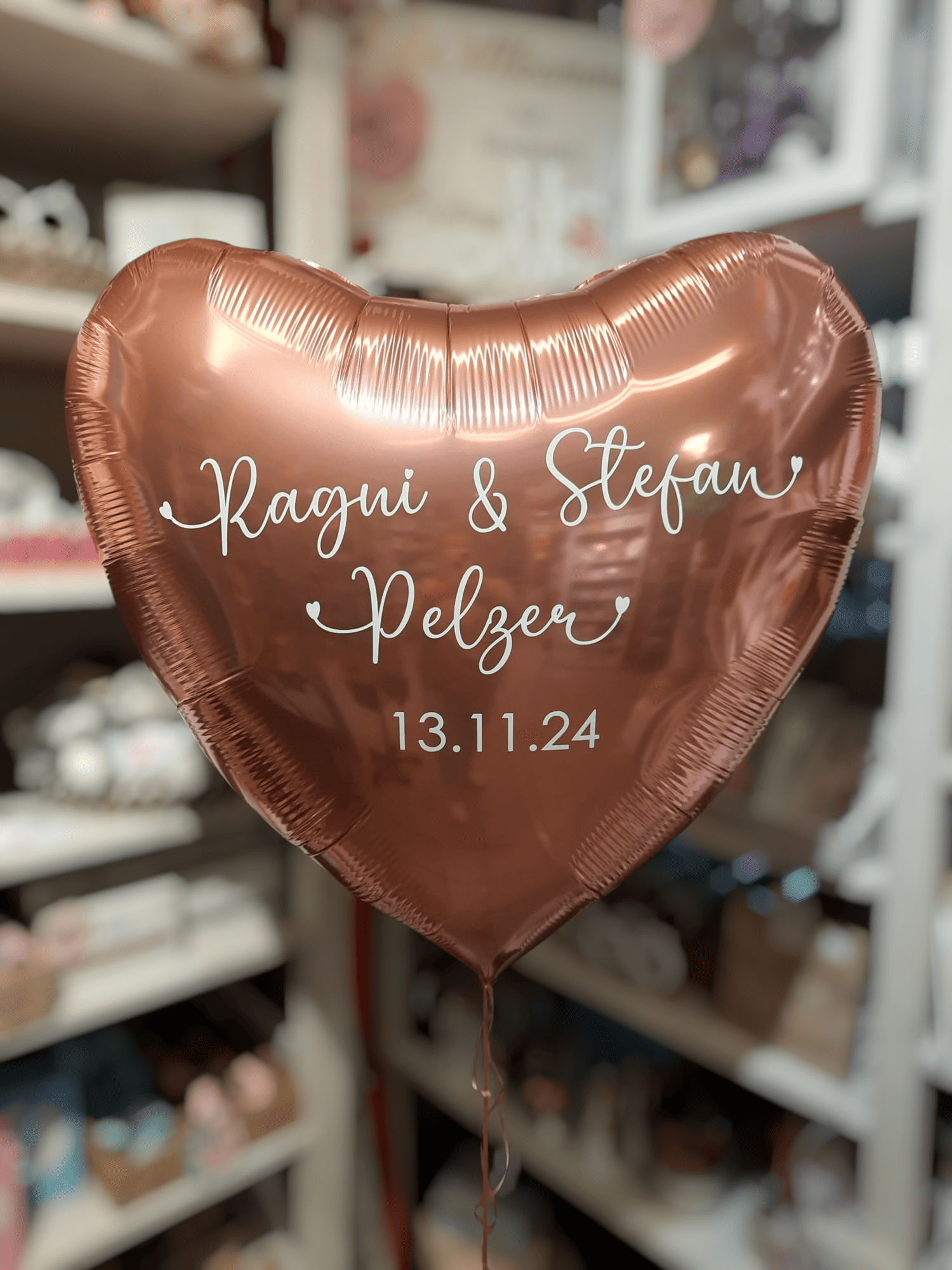 Herzballon aus Folie, mit Helium gefüllt, Größe ca. 75cm, Schwebezeit etwa 7 -10 Tage. Verschiedene Farben. Auf Wunsch personalisiert mit eigenem Text.