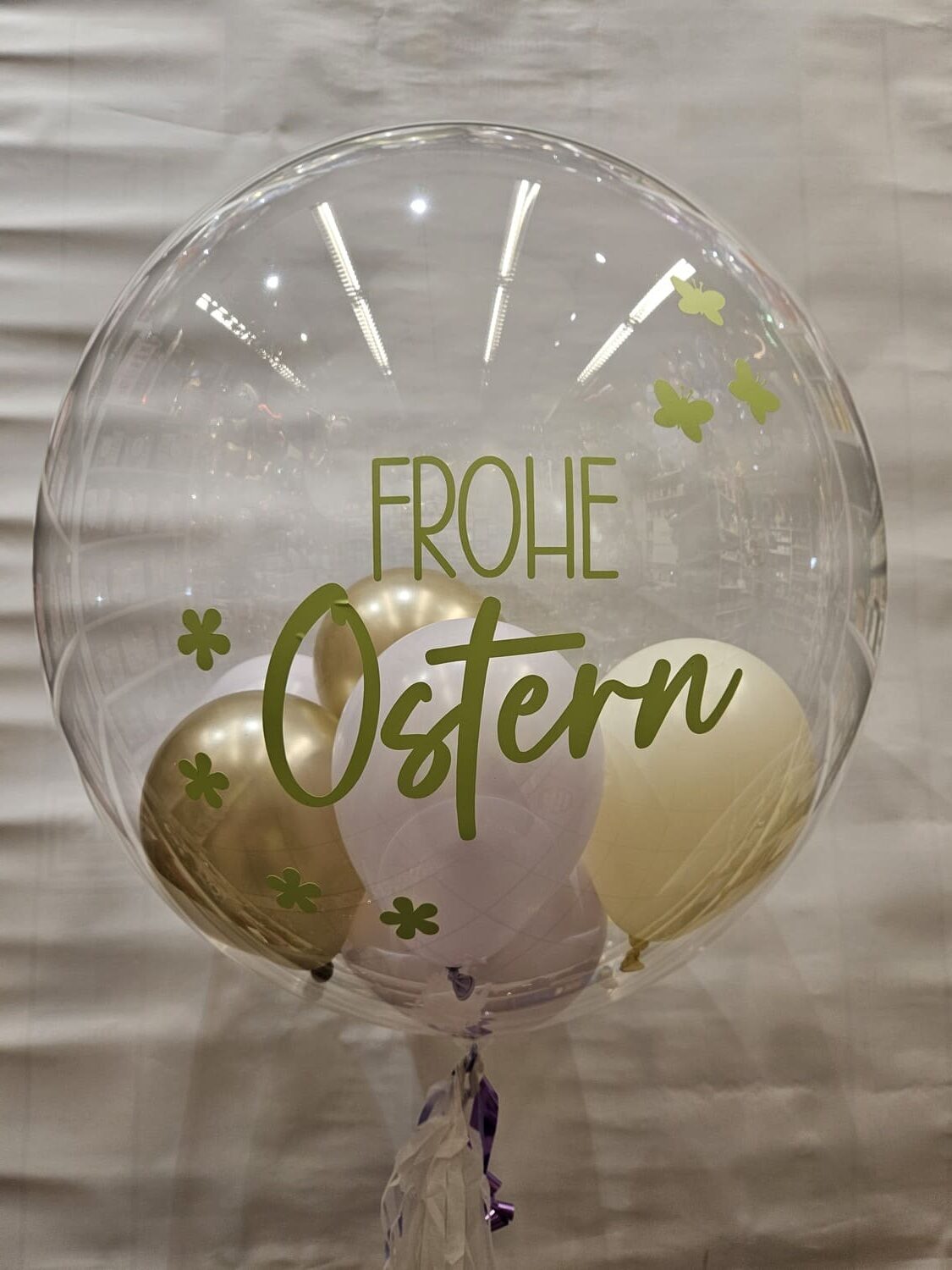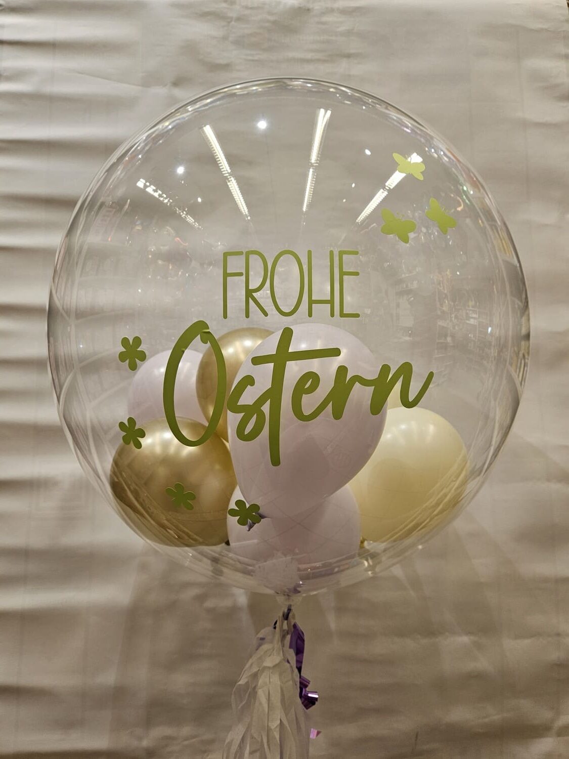 Bubble Ballon “Frohe Ostern”. Glasklarer Ballon mit 8 kleinen Ballons in Pastellfarben gefüllt. Mit Helium. Größe ca. 45 cm. Schwebezeit etwa 5 – 7 Tage.